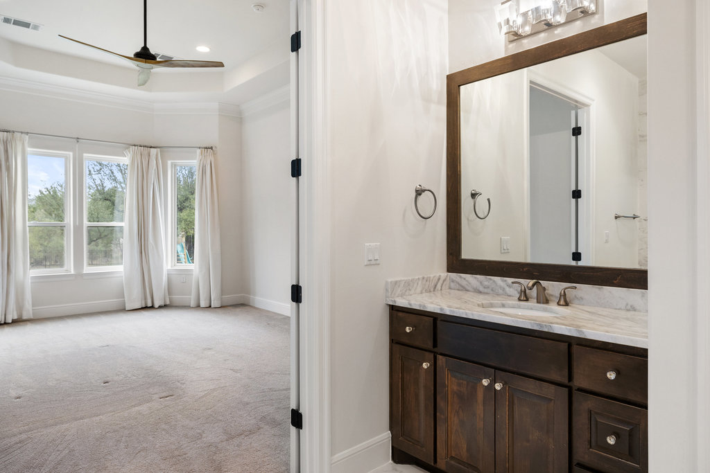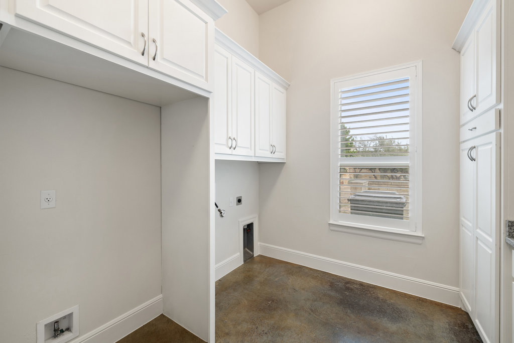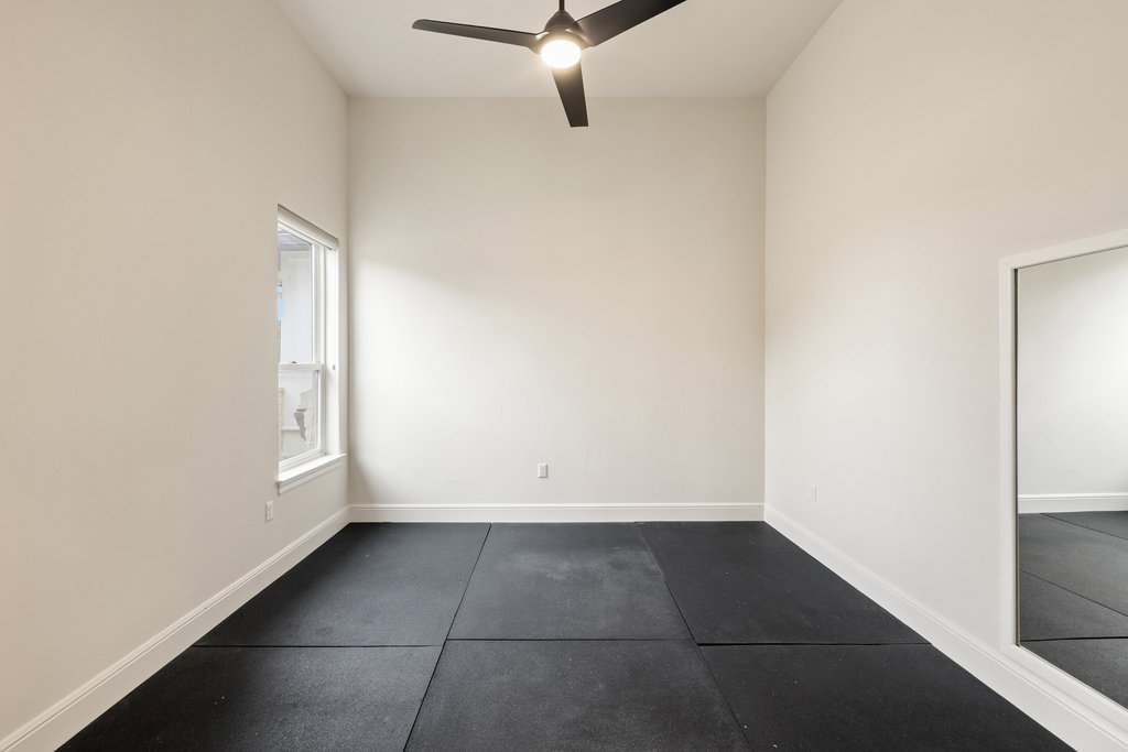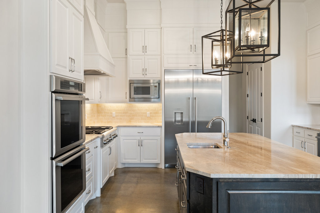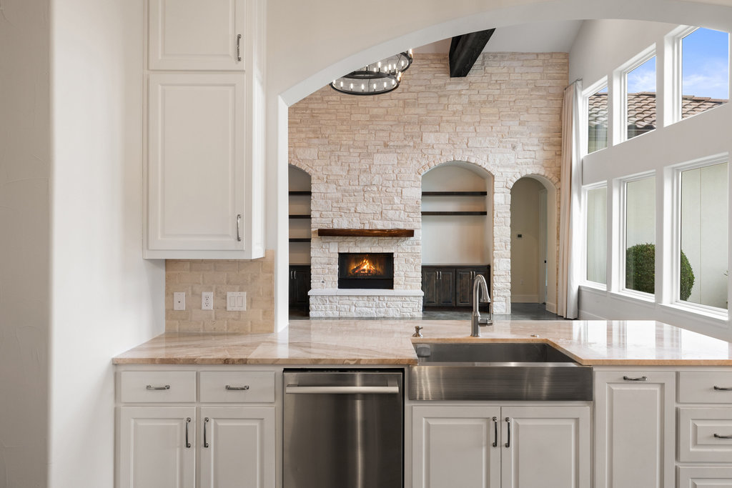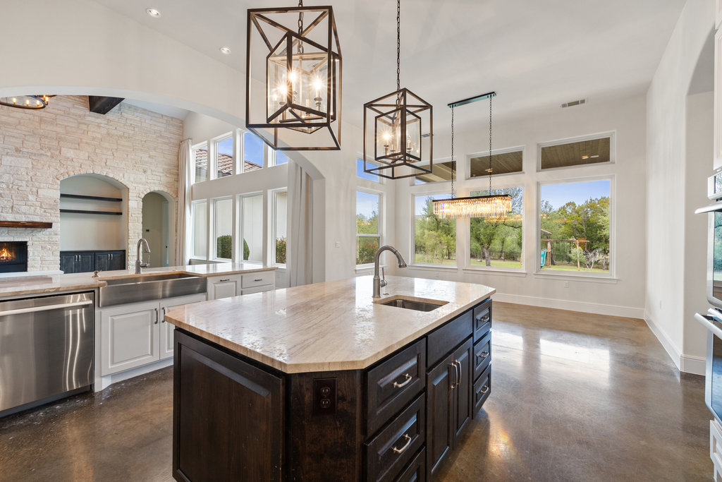 Workout/Flex Room: A versatile room ready to serve as a home gym, media room, or hobby space. The chef’s kitchen is a masterpiece of modern functionality, outfitted with premium Thermador appliances and seamlessly connecting to inviting living spaces. These areas are anchored by a statement fireplace featuring Texas limestone accents and enhanced by upscale designer lighting that highlights the clean, contemporary aesthetic.