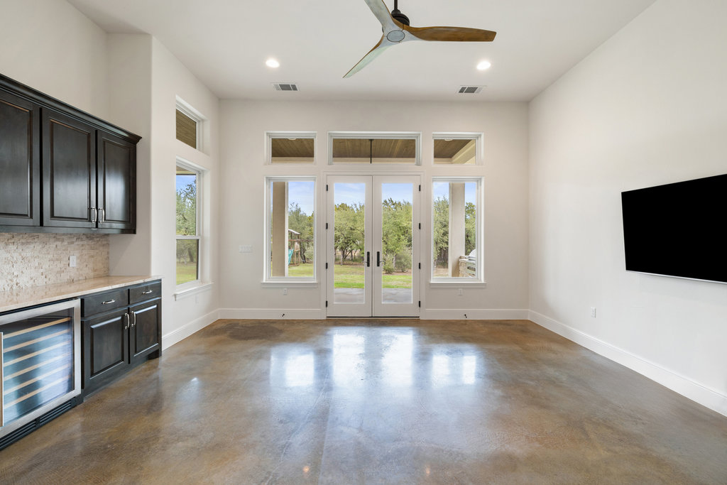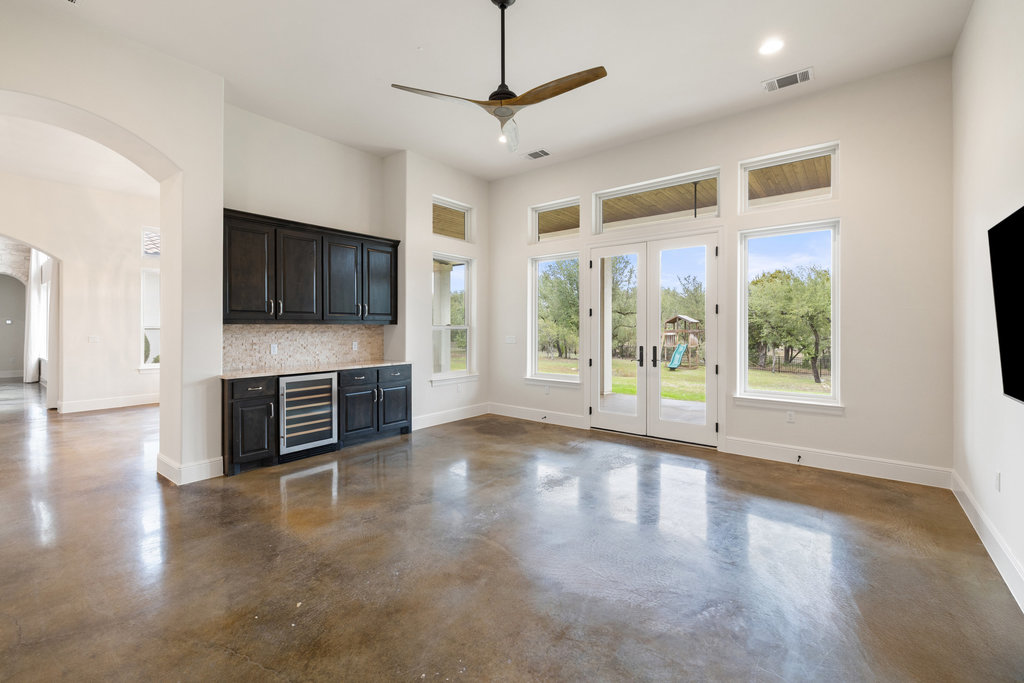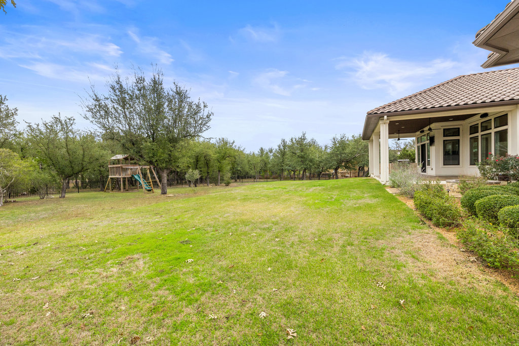 Entertain effortlessly with a dedicated bar area and expansive indoor-outdoor flow through elegant French doors —a hallmark of Hill Country living. The oversized backyard, backing to a serene greenbelt, offers exceptional privacy on a spacious 1.08-acre lot. This outdoor oasis is perfectly set up for year-round enjoyment, featuring: